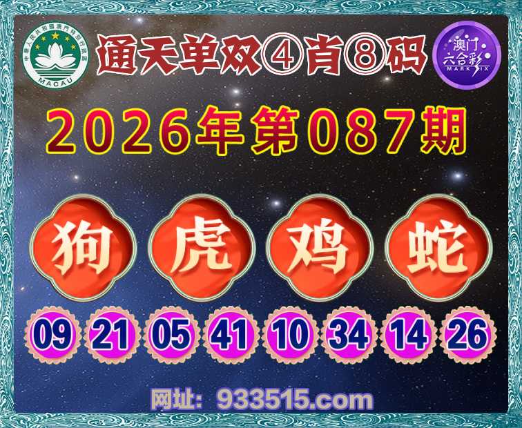 087期:『通天单双』 🏆④肖⑧码🏆【狗虎鸡】开:蛇26